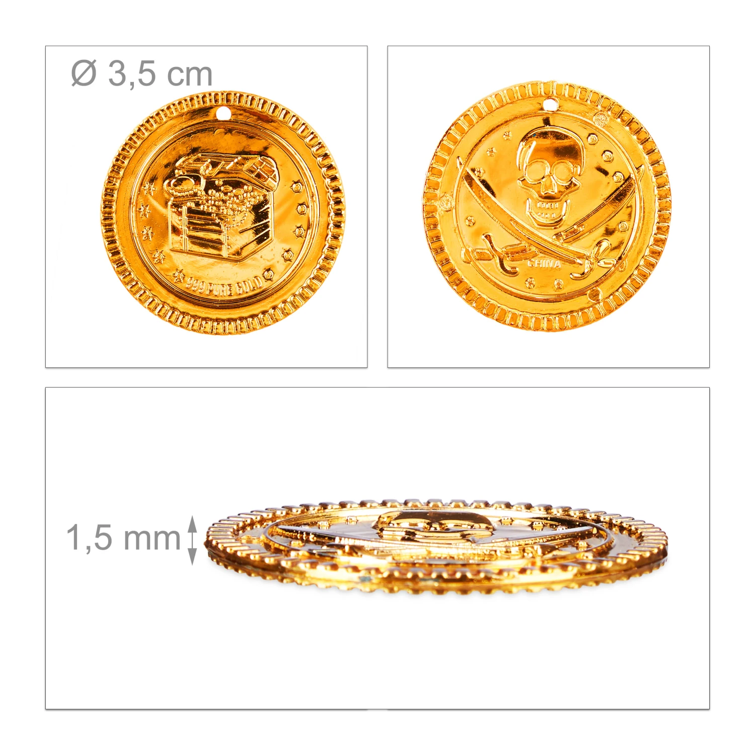Selbst das grandioseste Piraten-Outfit verfehlt seine Wirkung, wenn der stolze Kapitän keine Beute vorweisen kann. Damit Ihr kleiner Seeräuber dieses Malheur auf dem nächsten Kindergeburtstag souverän umschifft, darf dieser Piratenschatz nicht fehlen. Er besteht aus insgesamt 1152 Münzen. Das Spielgeld ist ideal für grandiose Abenteuer, überzeugt aber auch als Mitgebsel oder Dekoration auf einer Kinderparty. Dank der Löcher lassen sich die Goldtaler auffädeln, sodass sie sogar als Teil selbst gestalteten Piratenschmucks neugierige Blicke anlocken können.