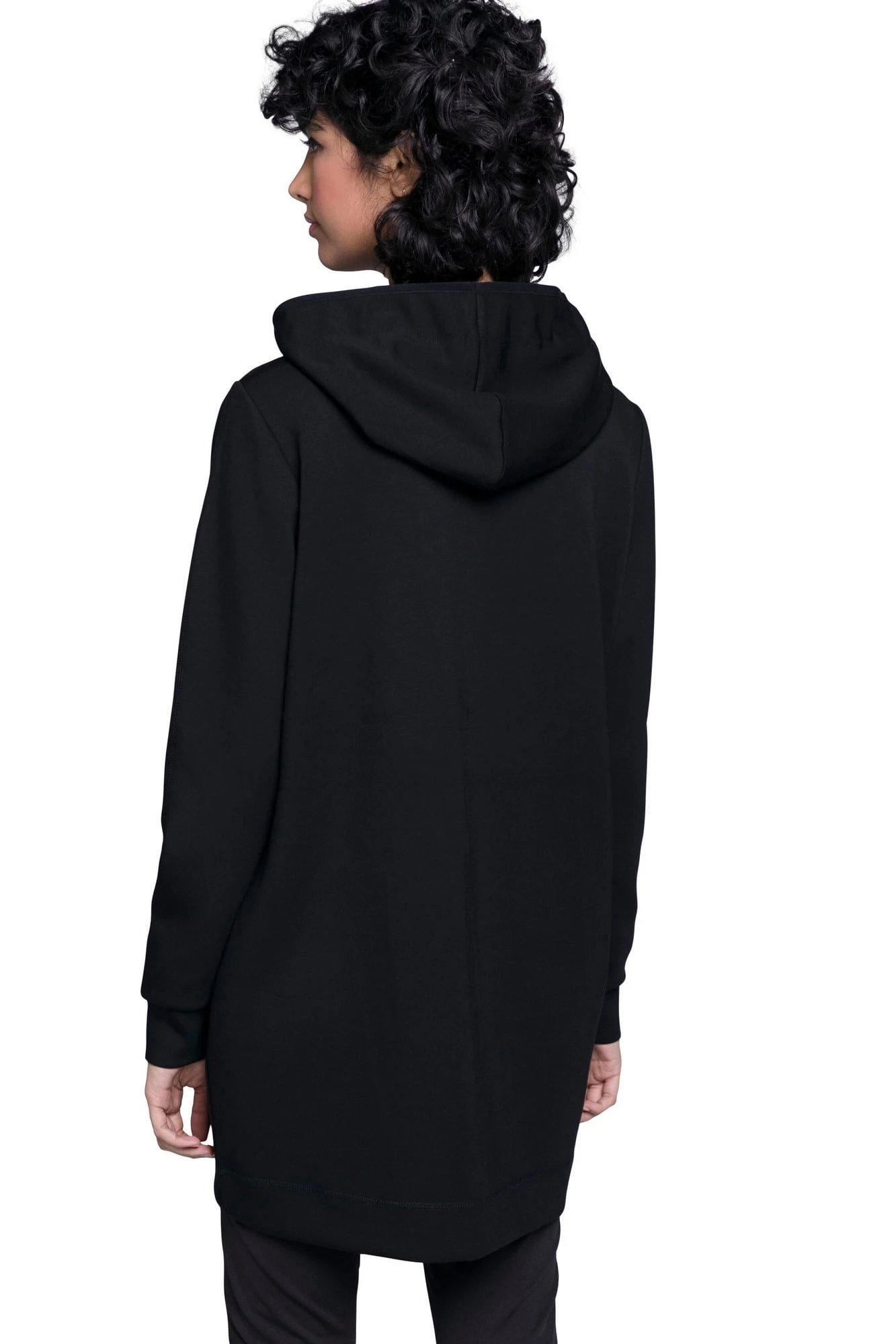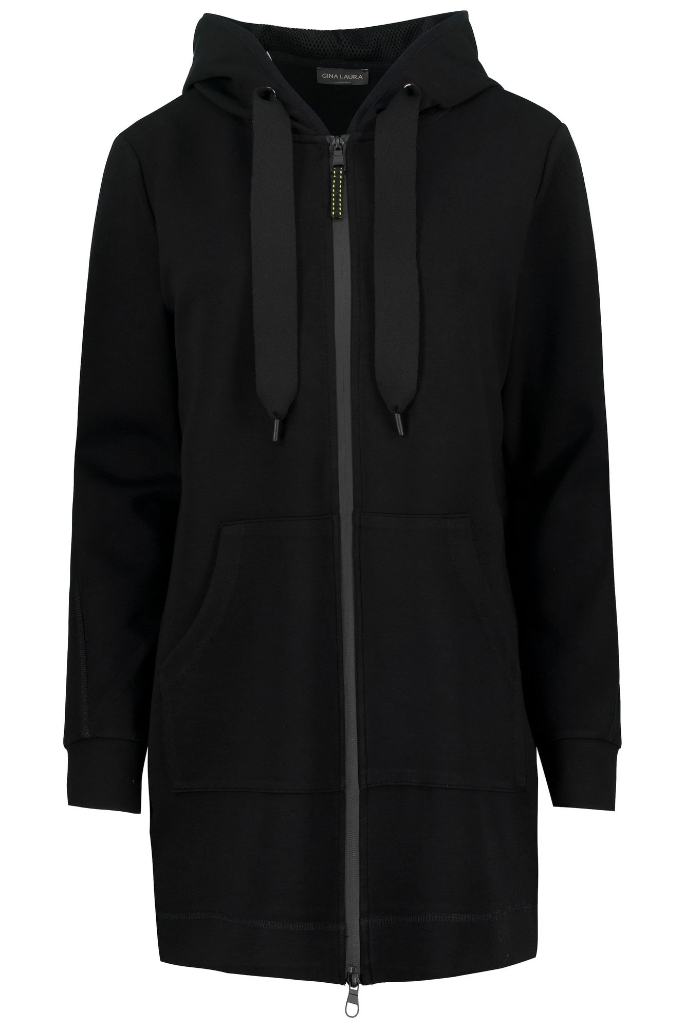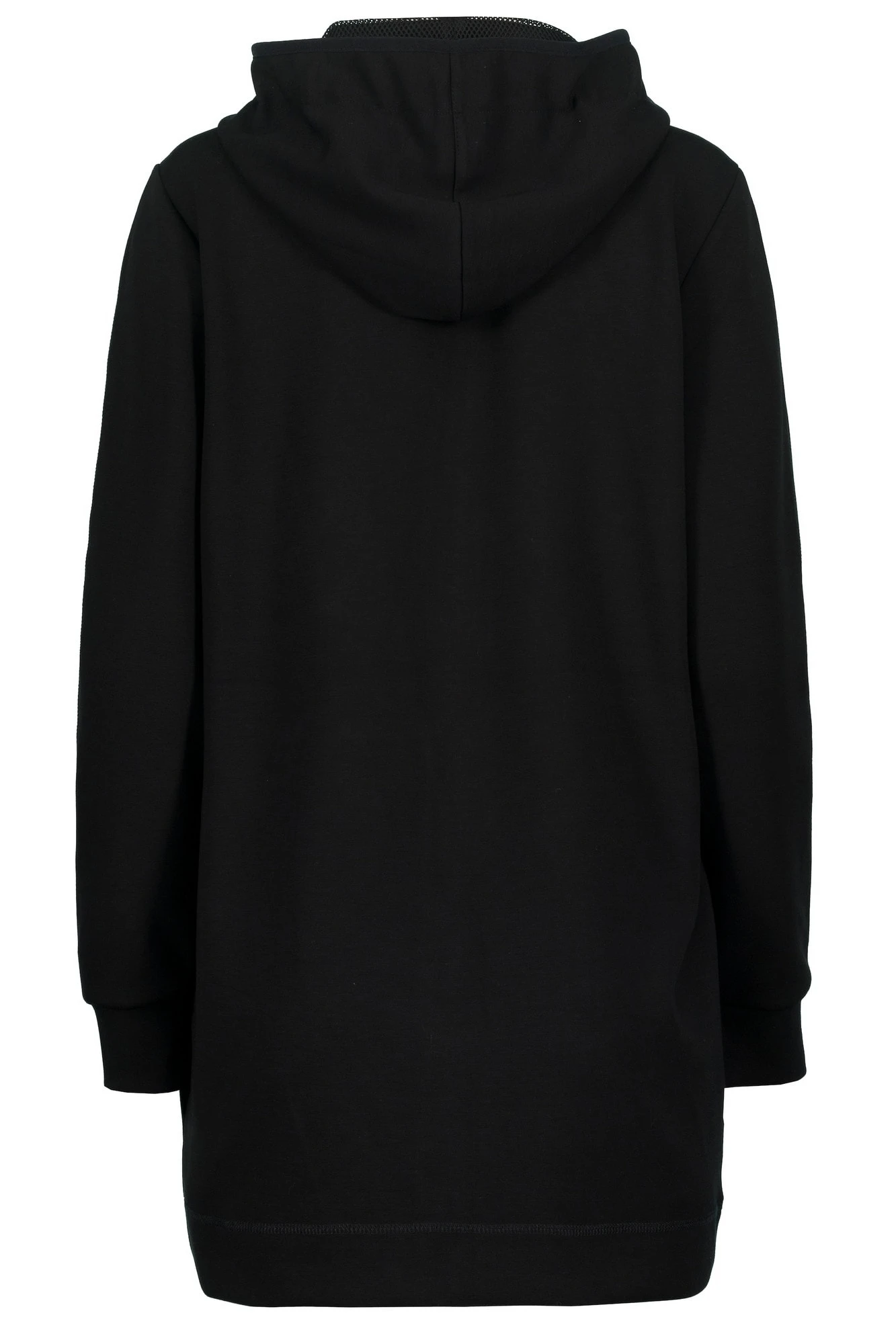 Long-Sweatjacke aus sporty Interlock-Sweat mit Kapuze, Bindeband und Zipper. Kängurutaschen, Langarm mit Rippbündchen. Das Model ist 174cm groß und trägt Größe 36/38.